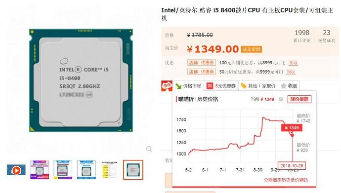 CPU推薦的是Intel八代甜品級處理器i5 8400,這款處理器散片前段時間價格一度漲到接近1800元,如今降至1349元左右,價格下降了好幾百。雖然說,相比歷史最低價依然存在一定的距離,但結合CPU主板套餐購買,價格還有優惠。