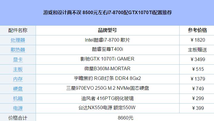 今天小編就為大家帶來了一套i7-8700配GTX1070Ti配置推薦配置推薦,預算在8500元左右,適合同時搞設計和游戲的群體朋友。