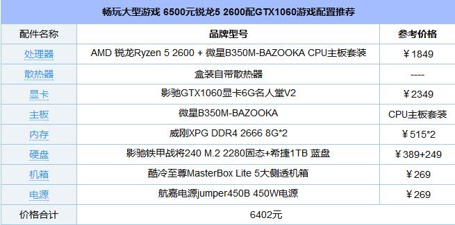 下面來看看小編為大家?guī)淼囊惶卒J龍5 2600配GTX1060游戲電腦配置,預(yù)算在6500元左右,這一套配置完全可以實(shí)現(xiàn)堡壘之夜特效全開畫質(zhì),詳情如下。