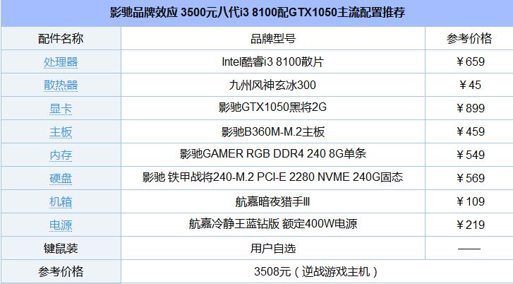 廢話不多說,下面是3500元八代i3 8100配GTX1050主流配置推薦單,如下表所示。