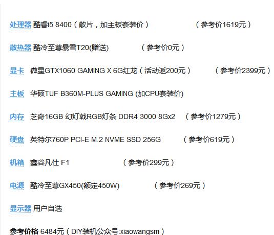 話不多說(shuō),來(lái)看看小編為這位網(wǎng)友帶來(lái)的i5 8400配GTX1066游戲電腦主機(jī)推薦,預(yù)算在6500元左右,定位中高端游戲主機(jī)。