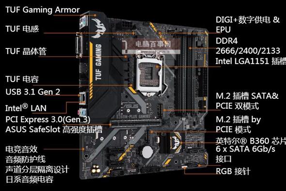主板方面,對于日常游戲家用的用戶來說,選擇更具性價比的 M-ATX 主板更為劃算,M-ATX 主板相比 ATX 主板在擴展性上少許差距,不過更多是在 PCIe 插槽上面,對于普通用戶來說并不重要,華碩TUF B360M-PLUS GAMING就有著非常突出的性價比。