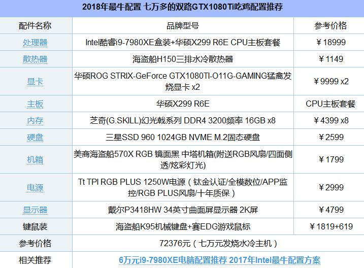 最牛i9+雙路1080 Ti+1T固態+128GB內存、1TB固態硬盤,小編只能說,沒辦法有錢任性。大家覺得花不止七萬配臺電腦,只為玩個“吃雞”游戲,值得嗎?