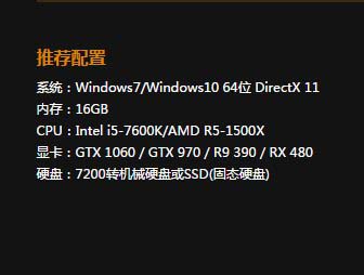 1、下面是《絕地求生》的官方推薦配置,從圖中可以看到,推薦內存為16G,推薦處理為i5-7600k或Ryzen5-1500X,推薦的顯卡有GTX 1060/GTX970/R9 390/RX 480,這三個部件也是電腦游戲主機的最大影響因素。處理器一般不會成為游戲性能的主要障礙,低端的處理器限制其他硬件的性能,對游戲運行的影響力度沒有顯卡和內存那么大。