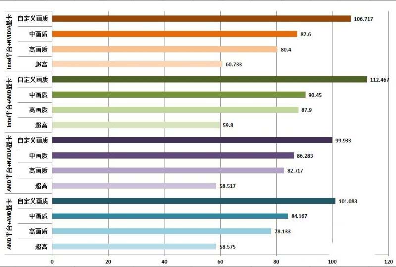 4、顯卡和內存是組裝電腦的主要花費之二,也是具有鮮明性能區別的主要部件,他們不像處理器那樣有更高的知名度,但一臺高性能的電腦同樣也離不開他們的參與構建。當然,從上面幾個測試的平均FPS圖中,我們也可以總結出一個規律,同樣平臺下調整超高畫質和自定義畫質對游戲的FPS的影響程度要比調整高畫質和中畫質大得多。