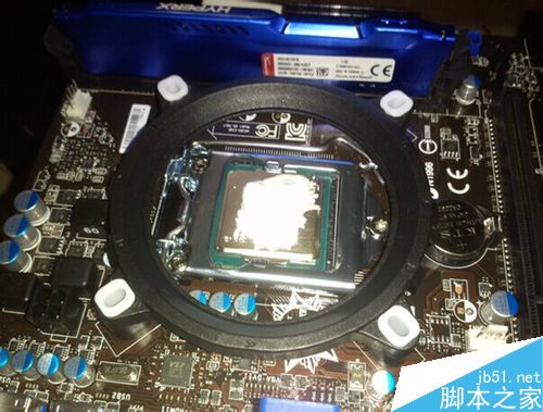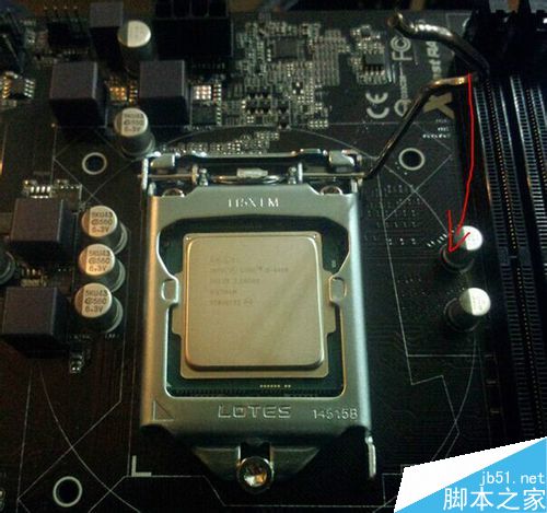 4、把散熱器卡到卡口上去,記得先撕掉接觸CPU那一面的薄膜,這個要注意兩點,一個是卡子的兩端一頭是能活動的,一頭是不能活動的,先把不能活動的那頭卡在剛才安的“黑圈子”上,然后再把另外一端壓下去卡在另外一頭。二是要注意風扇的方向,結(jié)構(gòu)是風扇→散熱器→機箱背面散熱孔。這樣才能把散熱器上的熱氣吹出去。