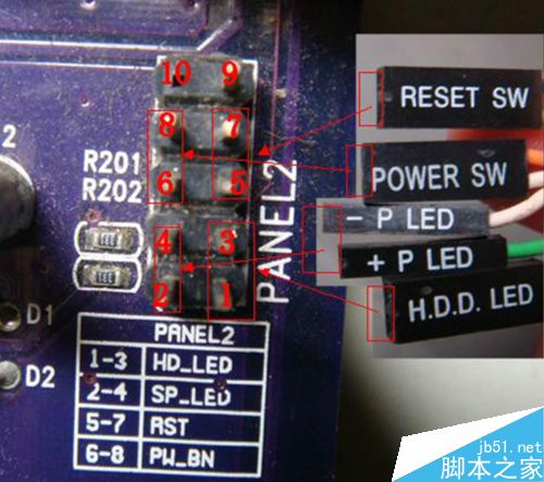 1、機箱前面板連線,一般有前置音頻,前置USB,1394.電源指示燈,硬盤指示燈,開機,重新啟動,這些連線,仔細看圖,是: 電源指示燈,硬盤指示燈,開機,重新啟動的接線圖,主板說明書上面一般都有說明的,如果沒有,看主板上面的也有寫的,注意針腳的位置,9.10是沒有用的,基本都是這樣連接,主板上面的HD -LED 是硬盤工作指示燈,就把線頭寫有:H..D.D.LED 的插在上面,主板上面的SP-LED 是電源工作指示燈,就把線頭寫有,P LED的正負端插上去, 這2個指示燈如果插反了正負級,通電后燈不會亮, 那個不亮的,就換下正負方向就可以了