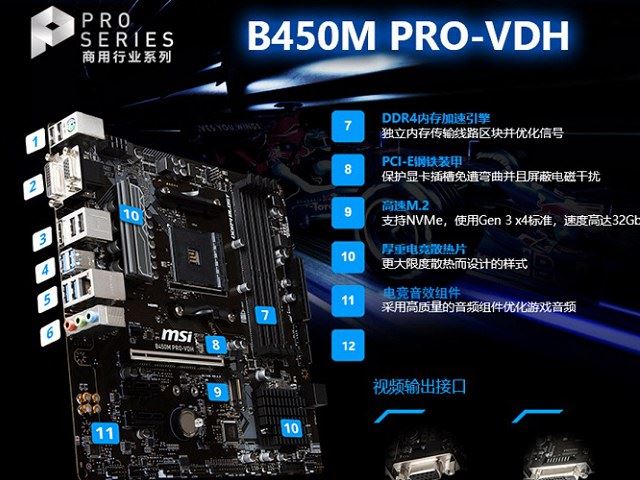 主板推薦的是微星B450M PRO VHD,一線品牌,主流型號產(chǎn)品,穩(wěn)定性、質(zhì)量與口碑都還不錯。這款主板雖然采用小板設(shè)計(jì),但五臟六全,配備4根內(nèi)存插槽和M.2全速固態(tài)硬接口,千兆網(wǎng)口和USB3.1接口也應(yīng)有盡有,并支持超頻,結(jié)合CPU主板套裝購買,可以享受更高的性價比。
