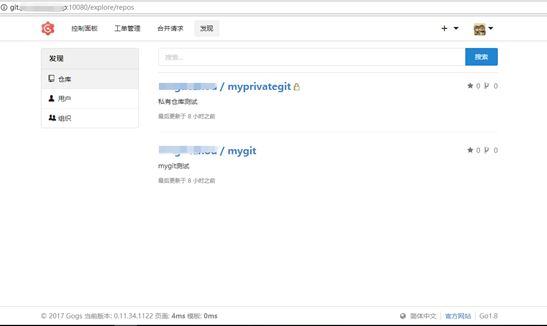 服務(wù)器搭建成功,創(chuàng)建了一個私有 和 公開的倉庫