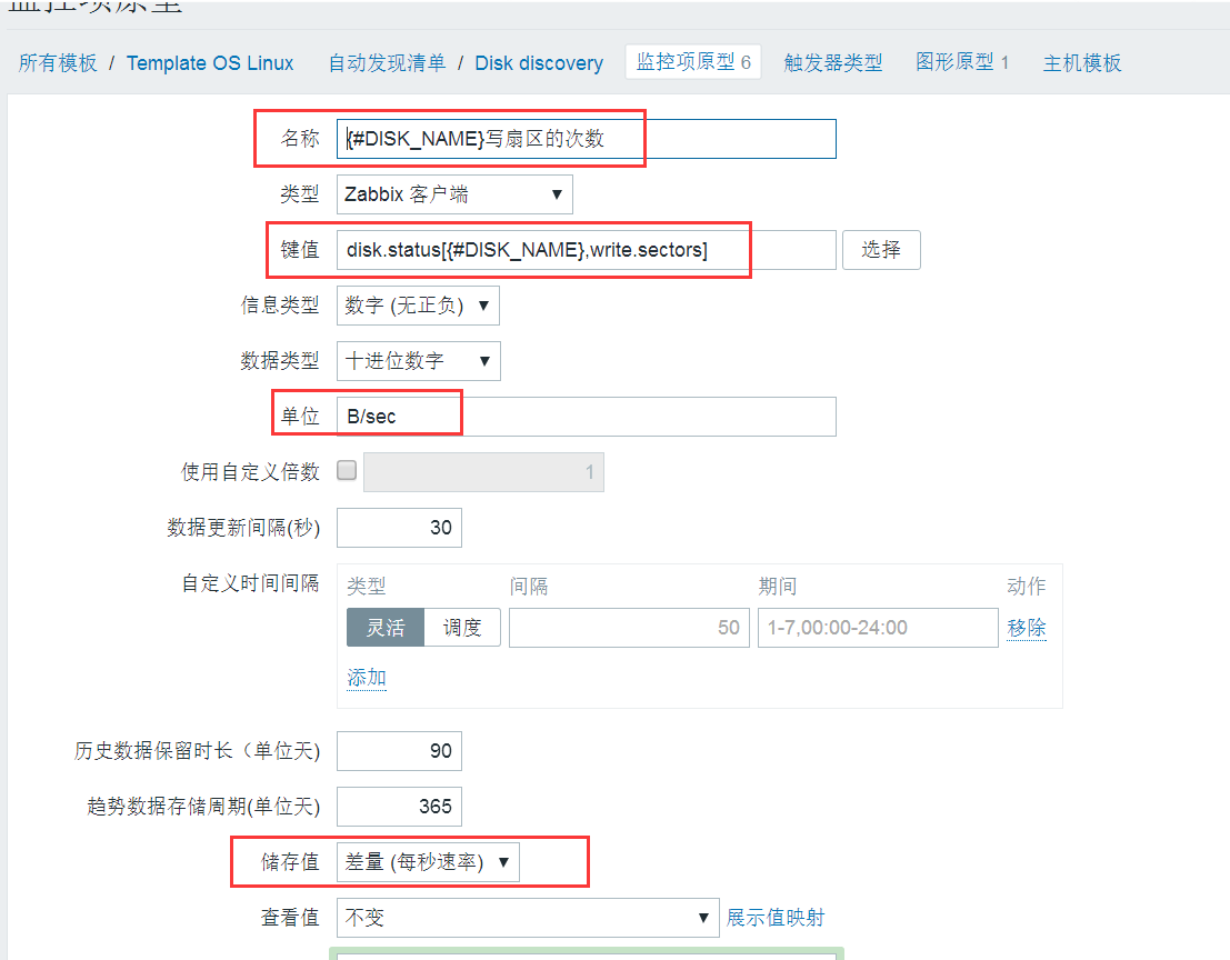 名稱: {#DISK_NAME}磁盤讀的次數鍵值: disk.status[{#DISK_NAME},read.ops]單位: ops/second儲存值:差量(每秒速率)名稱: {#DISK_NAME}磁盤寫的次數鍵值: disk.status[{#DISK_NAME},write.ops]單位: ops/second儲存值:差量(每秒速率)名稱: {#DISK_NAME}磁盤讀的毫秒數鍵值: disk.status[{#DISK_NAME},read.ms]單位: ms儲存值:差量(每秒速率)名稱: {#DISK_NAME}磁盤寫的毫秒數鍵值: disk.status[{#DISK_NAME},write.ms]單位: ms儲存值:差量(每秒速率)名稱: {#DISK_NAME}讀扇區的次數鍵值: disk.status[{#DISK_NAME},read.sectors]單位: B/sec使用自定義倍數: 512儲存值:差量(每秒速率)名稱: {#DISK_NAME}寫扇區的次數鍵值: disk.status[{#DISK_NAME},write.sectors]單位: B/sec使用自定義倍數: 512儲存值:差量(每秒速率)