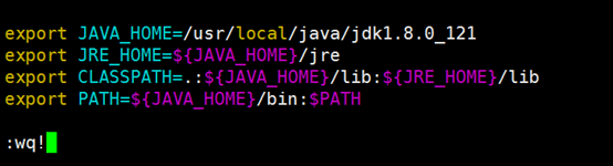 export JAVA_HOME=/usr/local/java/jdk1.8.0_121export JRE_HOME=${JAVA_HOME}/jreexport CLASSPATH=.:${JAVA_HOME}/lib:${JRE_HOME}/libexport PATH=${JAVA_HOME}/bin:$PATH