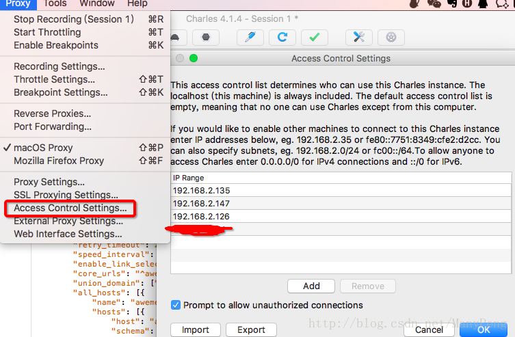 注意,有一些應用使用的網絡框架是不允許通過代理訪問的,此時通過charles抓包顯示的地址仍是unknown,或者手機上訪問該應用會提示網絡連接錯誤等信息,此時在MAC上取消勾選charles的SSL Proxying settings中的勾選框就可以正常訪問了