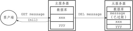 如果這時有客戶端向從服務器發送命令GET message,那么從服務器將發現message鍵已經過期,但從服務器并不會刪除message鍵,而是繼續將message鍵的值返回給客戶端,就好像message鍵并沒有過期一樣。