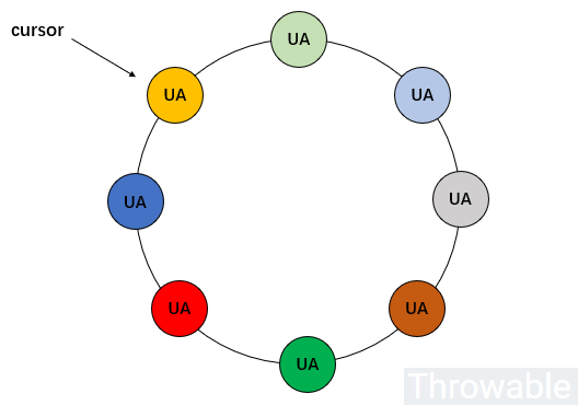 上圖中,假設不同顏色的 UA 是完全不同的 UA ,它們通過洗牌算法打散放進去環形隊列中,實際上每次取出一個 UA 之后,只需要把游標 cursor 前進或者后退一格即可(甚至可以把游標設置到隊列中的任意元素)。最終的實現就是:需要通過中間件實現分布式隊列(只是隊列,不是消息隊列)。