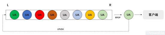 UA 數據集合一般不會太大,考慮先把這個集合的數據隨機打散,如果使用 Java 開發可以直接使用 Collections#shuffle() 洗牌算法,當然也可以自行實現這個數據隨機分布的算法, 這一步對于一些被模擬方會嚴格檢驗 UA 合法性的場景是必須的 。UA 數據到 Redis 列表中。RPOP + LPUSH 的 Lua 腳本,實現分布式循環隊列。編碼和測試示例