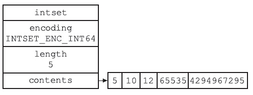typedef struct intset { // 編碼方式 uint32_t encoding; // 集合包含的元素數量 uint32_t length; // 保存元素的數組 int8_t contents[];} intset;