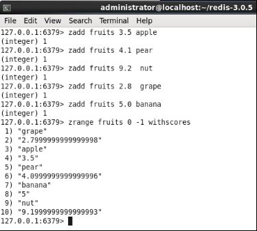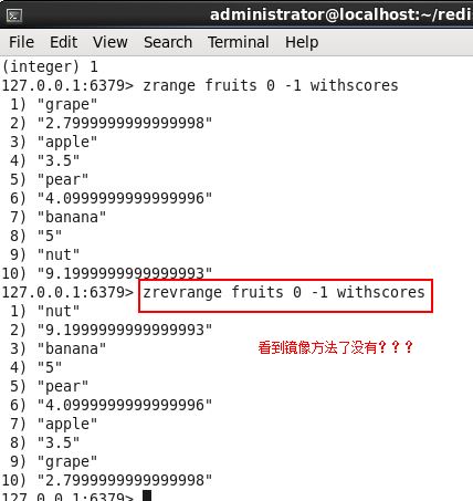 127.0.0.1:6379> zrem fruits apple(integer) 1127.0.0.1:6379> zrange fruits 0 -1 withscores1) "grape"2) "2.7999999999999998"3) "pear"4) "4.0999999999999996"5) "banana"6) "5"7) "nut"8) "9.1999999999999993"127.0.0.1:6379>