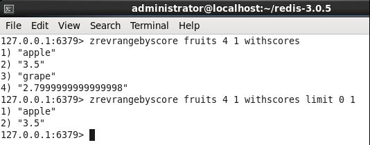 127.0.0.1:6379> zrevrangebyscore fruits 4 1 withscores1) "apple"2) "3.5"3) "grape"4) "2.7999999999999998"127.0.0.1:6379> zrevrangebyscore fruits 4 1 withscores limit 0 11) "apple"2) "3.5"127.0.0.1:6379>