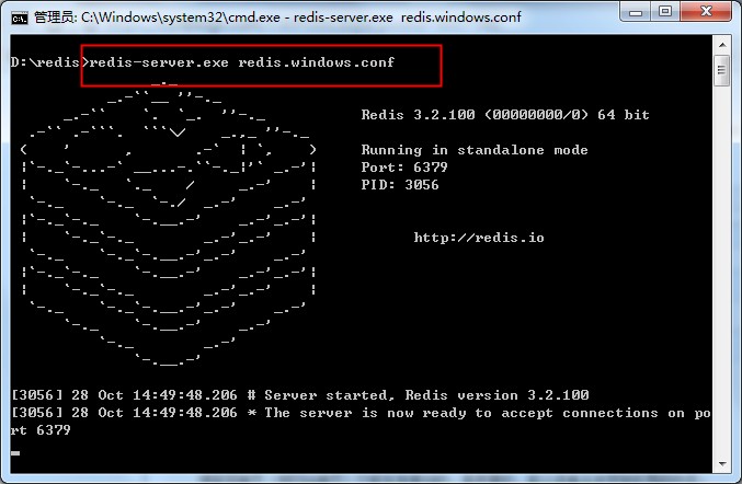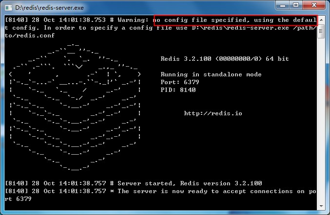 紅框內可以看到,no config file specified, using the default config,這樣啟動沒問題,可以自己檢測一下,在安裝目錄下打開命令窗口,運行命令 redis-cli.exe -h 127.0.0.1