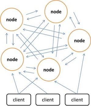 相較于Memcached只能采用客戶端實現分布式存儲,Redis更偏向于在服務器端構建分布式存儲。最新版本的Redis已經支持了分布式存儲功能。Redis Cluster是一個實現了分布式且允許單點故障的Redis高級版本,它沒有中心節點,具有線性可伸縮的功能。下圖給出Redis Cluster的分布式存儲架構,其中節點與節點之間通過二進制協議進行通信,節點與客戶端之間通過ascii協議進行通信。在數據的放置策略上,Redis Cluster將整個key的數值域分成4096個哈希槽,每個節點上可以存儲一個或多個哈希槽,也就是說當前Redis Cluster支持的最大節點數就是4096。Redis Cluster使用的分布式算法也很簡單:crc16( key ) % HASH_SLOTS_NUMBER。
