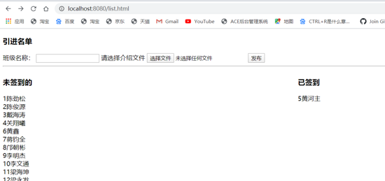 <!DOCTYPE html><html lang="en"><head> <meta charset="UTF-8"> <title>簽到頁面</title> <script src="http://apps.bdimg.com/libs/jquery/2.1.1/jquery.min.js" type="text/javascript" charset="utf-8"></script></head><body> 請輸入你的姓名:<input type="text" id="name"/> <input type="button" id="sign" value="簽到"/></body><script type="text/javascript"> $(function () { $("body").on("click","#sign",function(){ $.ajax({ type:"get", url:"/sign", data:{"name":$("#name").val()}, success:function(data){ console.log(data); if(data=="ok"){ alert("簽到成功,返回簽到頁面") //刷新當前頁面 location.reload(); }else { alert("簽到成功,請重新簽到") } } }); }) }) </script></html>list.html頁面效果圖