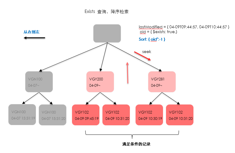 從現(xiàn)有的索引及條件來看,由于同時(shí)存在gt、exists以及葉子節(jié)點(diǎn)的時(shí)間范圍限定,不可避免的會(huì)產(chǎn)生seeks操作,
