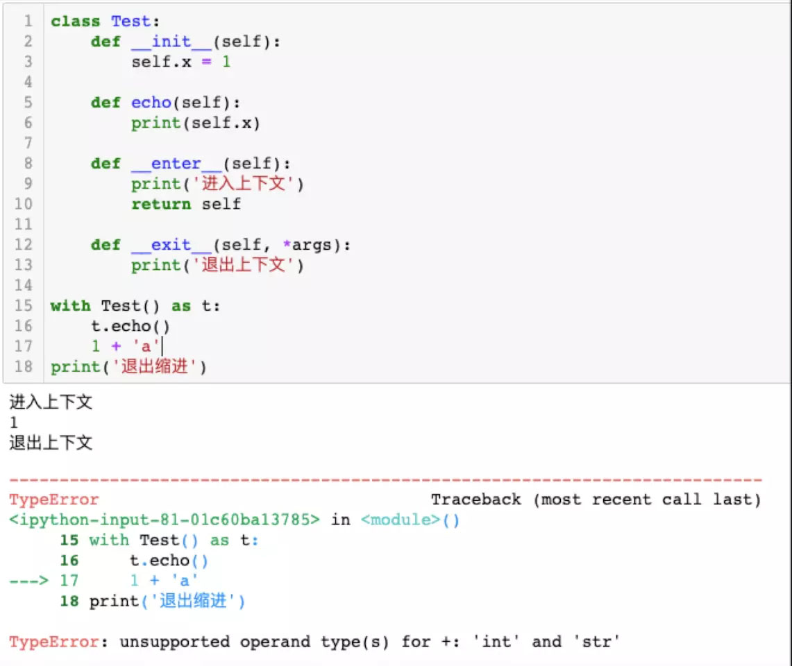 class Test: def __init__(self): self.x = 1 def echo(self): print(self.x) def __enter__(self): print('進入上下文') return self def __exit__(self, *args): print('退出上下文') with Test() as t: t.echo() 1 + 'a' # 這里一定會報錯print('退出縮進')運行效果如下圖所示: