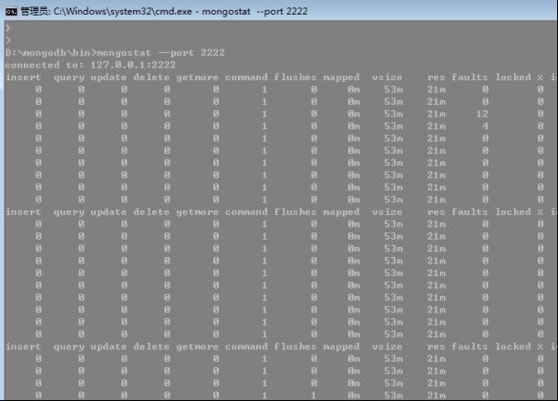 前面那些統計信息再牛X,那也是靜態統計,不能讓我觀看實時數據變化,還好,mongodb里面提供了這里要說的mongodstat監視器,這玩意會每秒刷新,在實際生產環境中大有用處,還是截張圖,很有意思,是不是感覺大軍壓境了。