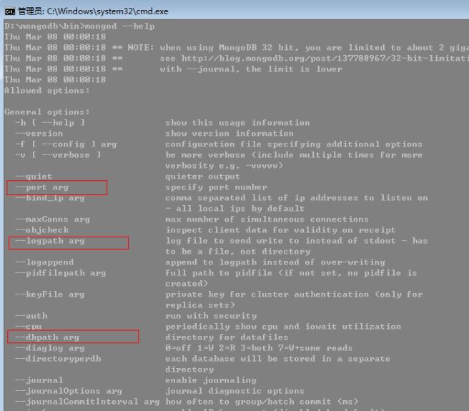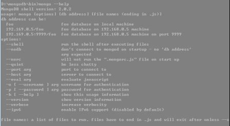 還要提醒大家一點的就是,這些命令參數很多很復雜也就很容易忘,不過沒關系,數據庫給我們提供了一個help方法,我們可以拿mongod和mongo說事。