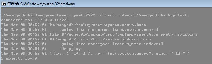 快看,數據已經備份過來了,太爽了,現在我們用mongorestore恢復過去,記住啊,它是不用關閉機器的。