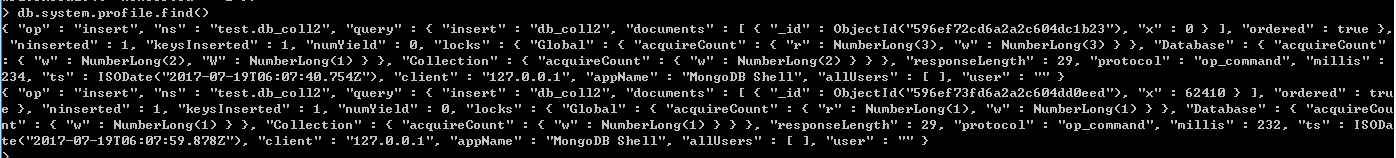 通過db.system.profile.find() 查看當前的監控日志