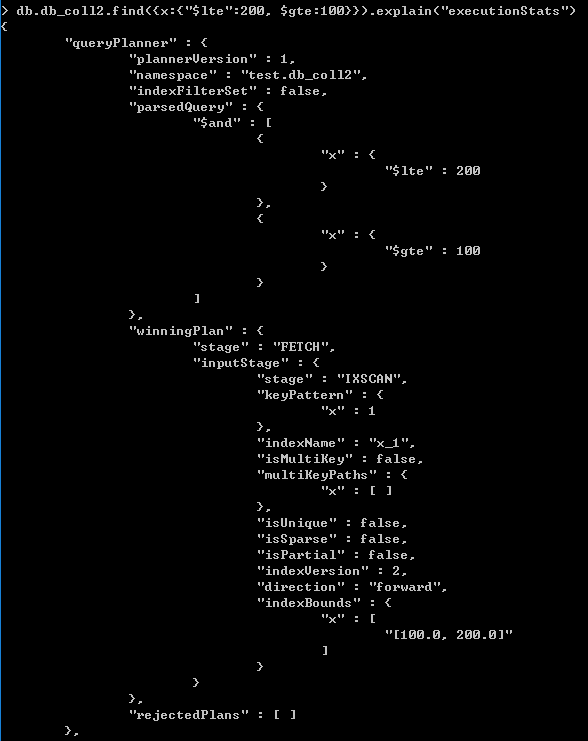 接著,尋找time范圍在100和200之間的文檔,并使用explain()