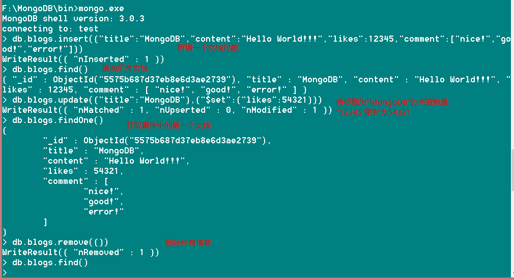 c)、通過shell可以進行對數據的四個基本操作:創建,讀取,更新和刪除(即CRUD)操作;