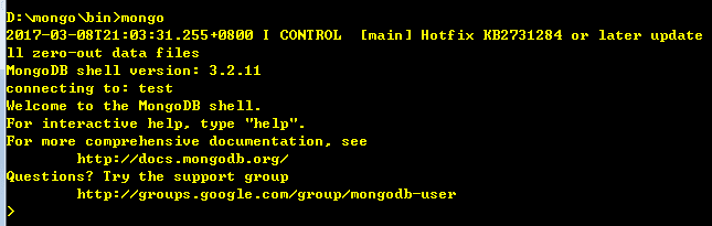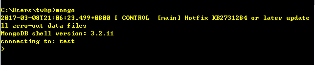 如果不報錯,那么已經成功了,此時,不要關閉終端,不要關閉,因為這是在啟動服務,你關了之后是沒法用的。另外開一個終端,輸入mongo,顯示如下,那么你可以使用mongo了。