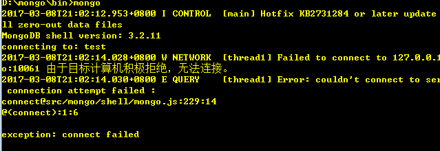 如果你沒有安裝在默認目錄下,那么你進入bin目錄下,然后啟動命令行,輸入mongo,回車,你會發現報錯了。