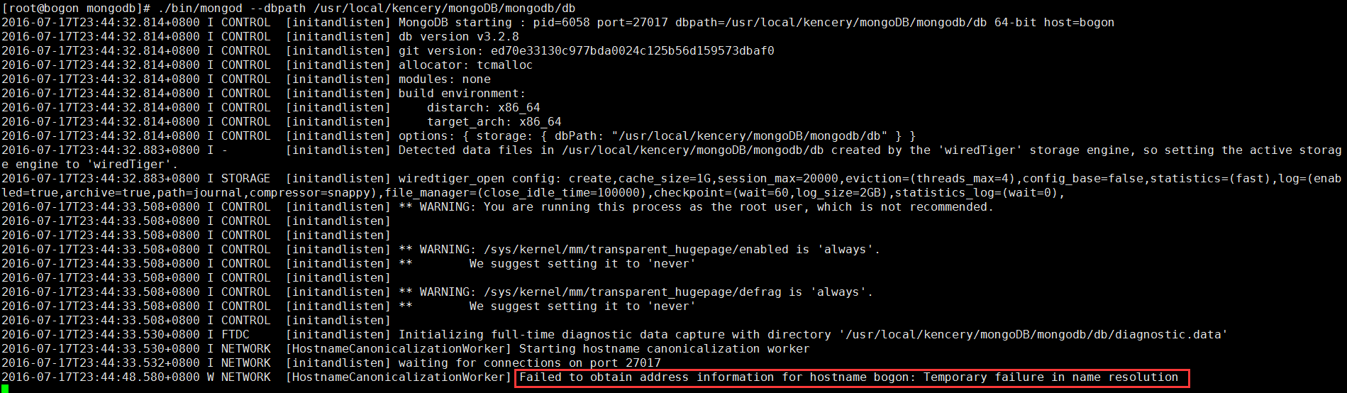 f.2 當(dāng)執(zhí)行命令的時候如上圖所示,我們發(fā)現(xiàn)出現(xiàn)了錯誤,錯誤信息是:(Failed to obtain address information for hostname bogon: Temporary failure in name resolution(獲取不到地址對應(yīng)的主機(jī)名)),這是因為mongoDB啟動需要解析hosts,所以我們打開hosts給本地IP配置主機(jī)名bogon,命令如下:
