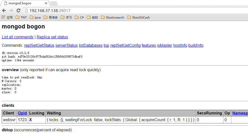e.最后通過瀏覽器訪問MongDB的web頁面,如圖所示:則說明配置已經(jīng)成功。