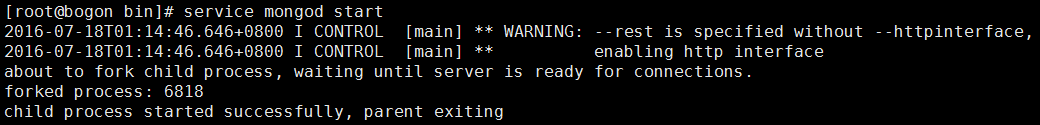 (2) 重新啟動mongoDB,發(fā)現(xiàn)錯誤已經(jīng)消失,并且mogodb已經(jīng)啟動。