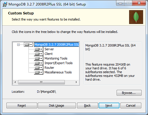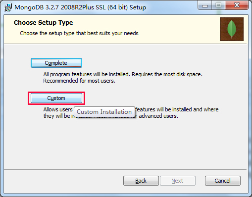 通過點擊 "Custom(自定義)" 按鈕來設置你的安裝目錄,我將其安裝在D:/MongoDB