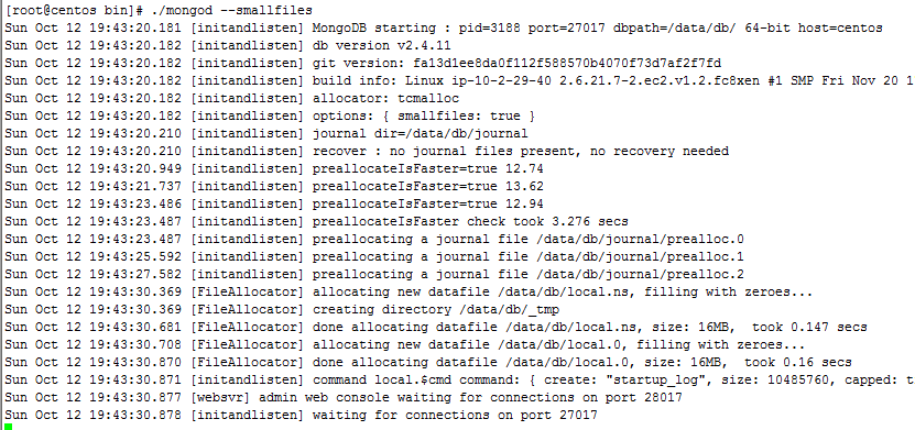 進入解壓完之后的mongodb文件夾,進入bin目錄,運行./mongod,發現出現錯誤信息:Please make at least 3379MB available in /data/db/journal or use --smallfiles,提示空間不夠