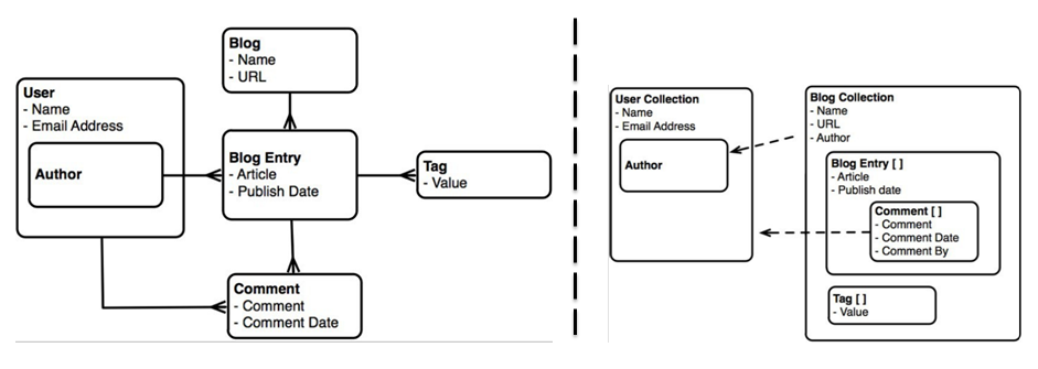 這個一個博客的數據模型,有Blog,User等表。左側是關系模型,右側是文檔模型。這個文檔模型并不是完全合理,可以作為“正反兩面教材”在下文不斷闡述。