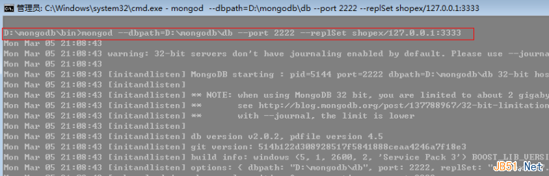 這里就把D盤里面的mongodb程序打開,端口為2222。指定端口為3333是shopex集群下的另一個數據庫服務器。