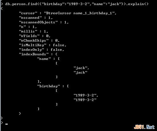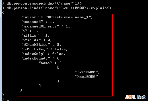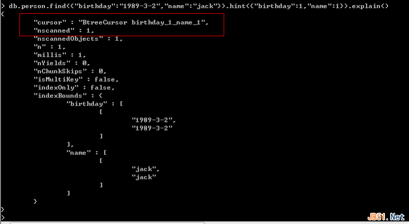 cursor: 這里出現的是”BtreeCursor",這么牛X,mongodb采用B樹的結構來存放索引,索引名為后面的“name_1"。