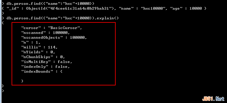 好了,數據已經插入成功,既然我們要做分析,肯定要有分析的工具,幸好mongodb中給我們提供了一個關鍵字叫做“explain",那么怎么用呢?