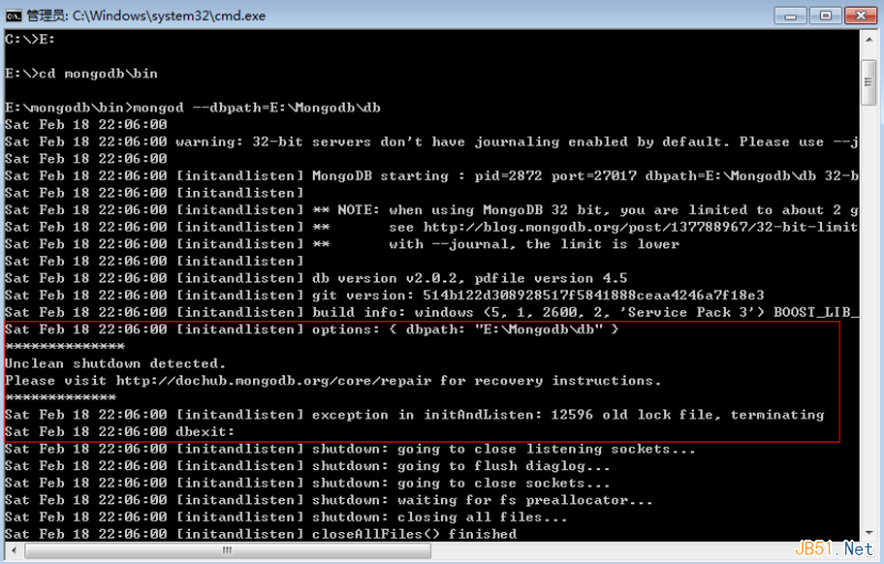 傻眼了,擦,竟然開啟不了,仔細觀察“劃線區域“的信息,發現db文件夾下有一個類似的”lock file”阻止了mongodb的開啟,接下來我們要做的就