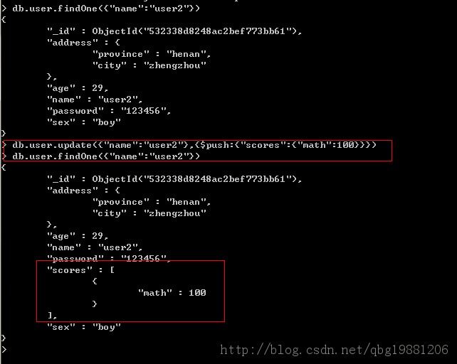 $push:數(shù)組修改器,如果指定的鍵存在,則向已有的數(shù)組末尾加入一個元素,鍵不存在則會創(chuàng)建一個新的數(shù)組。