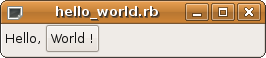 require 'gtk2' require 'simple_layout' class MyWin < Gtk::Window include SimpleLayout::Base def initialize super add my_layout signal_connect('destroy') do Gtk.main_quit end end def my_layout hbox do label 'Hello, ' button 'World !' end end end