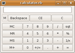 require 'gtk2' require 'simple_layout' class MyWin < Gtk::Window include SimpleLayout::Base def initialize super add my_layout signal_connect('destroy') do Gtk.main_quit end end def my_layout vbox do with_attr :border_width => 3 do hbox do entry :id => :ent_input, :layout => [true, true, 5] end hbox do frame do label 'M', :set_size_request => [20, 20] end hbutton_box do button 'Backspace' button 'CE' button 'C' end end hbox do vbutton_box do button 'MC' button 'MR' button 'MS' button 'M+' end with_attr :layout => [true, true] do number_and_operators_layout end end end end end def number_and_operators_layout vbox do [ ['7', '8', '9', '/', 'sqt'], ['4', '5', '6', '*', '%'], ['1', '2', '3', '-', '1/x'], ['0', '+/=', '.', '+', '=']].each do |cols| hbox :layout => [true, true] do cols.each do |txt| button txt, :set_size_request => [20, 20], :layout => [true, true] end end end end end end