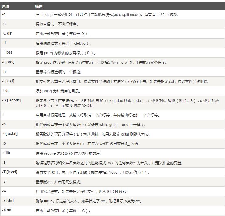 $ ruby [ options ] [.] [ programfile ] [ arguments ... ]