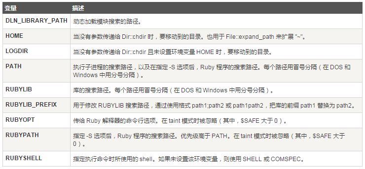Ruby 解釋器使用下列環境變量來控制它的行為。ENV 對象包含了所有當前設置的環境變量列表。